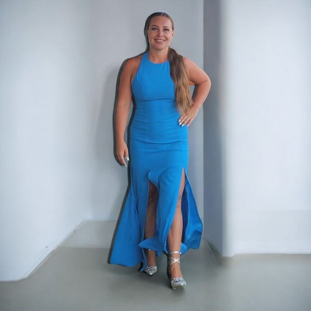 Vestido elegante y sofisticado en un entorno minimalista con paredes blancas. El vestido, en un vibrante tono azul, resalta su estilo y figura. Color azul intenso que aporta frescura y sofisticación, destacando por su tono llamativo y versátil. Sin mangas, con un escote halter que deja los hombros al descubierto, estilizando la parte superior del cuerpo. El vestido está ceñido al cuerpo, resaltando la silueta de manera favorecedora. Falda con aberturas: Cuenta con dos aberturas frontales, que añaden movimiento y un toque sensual al caminar.