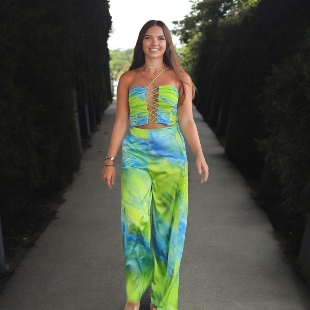 Top tipo bandeau: Es ajustado al cuerpo, con un diseño de aberturas o fruncidos en la parte delantera. Combina tonos verdes, amarillos y azules en un patrón tie-dye, lo que le da un toque fresco y juvenil.